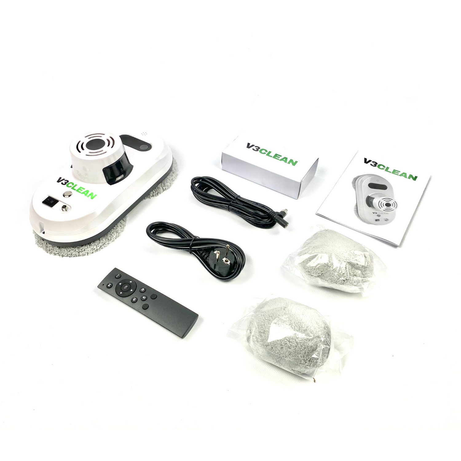 Le robot lave vitre V3CLEAN® est livré avec un cordon de sécurité anti-chute, 6 patins en micro-fibre, et sa télécommande. Les pièces détachées sont disponibles pendant 10 ans.